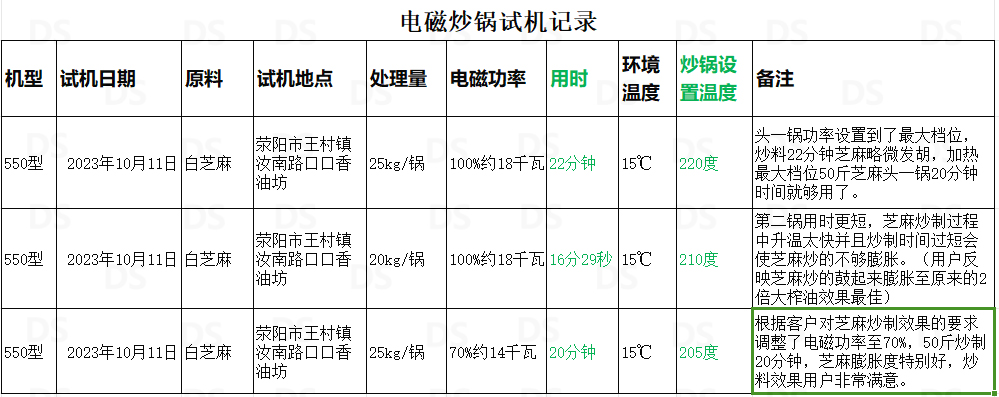今天是2023年10月11日,今天早上我們的新型550電磁炒貨機在滎陽市王村鎮(zhèn)汝南路口口香油坊進行了測試試用,測試物料為白芝麻,用戶壓榨香油用。用戶油坊內(nèi)現(xiàn)有的電磁炒貨機每鍋可裝芝麻160斤,電磁功率跟我們相同為20千瓦,炒50斤芝麻冷鍋情況下需要32分鐘左右。我們的炒貨機冷鍋情況下50斤芝麻用時22分鐘(根據(jù)實際情況20分鐘即可炒好),今天測試了三鍋,平均每鍋用時20分鐘左右,用戶對我們的炒料效果和效率非常滿意。詳細(xì)測試數(shù)據(jù)我列了個表,大家可以看下。